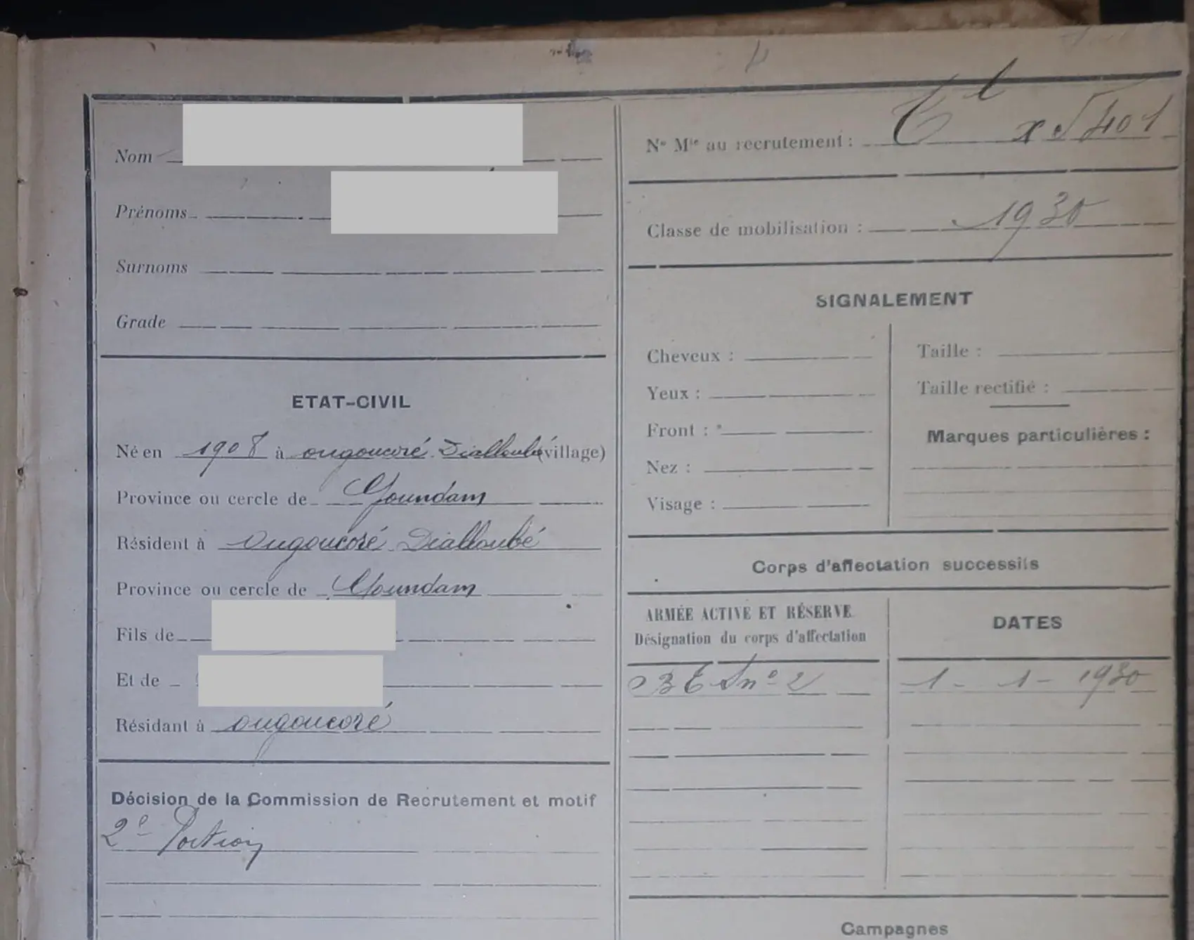 The French colonial administration drew up individual registers of young Africans recruited into the French colonial army as soldiers, forced labourers or reservists.